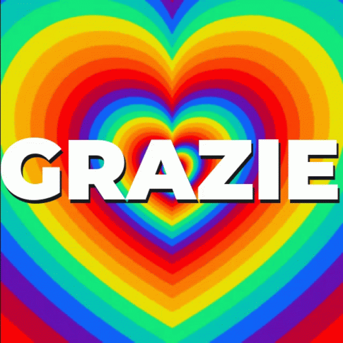 A vibrant, pulsating rainbow heart with the word 'Grazie' (Thank you) in the center.