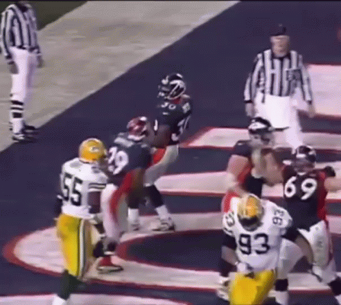 An intense NFL football tackle featuring a Green Bay Packers player (number 93) and a Denver Broncos player.