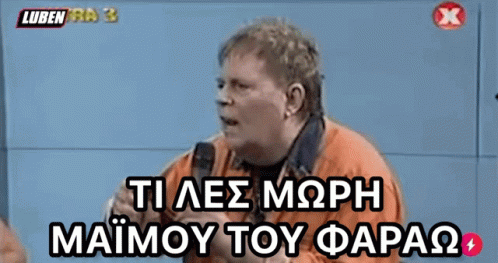 A man from Greek TV show Luben speaks into a microphone, with the caption 'WHAT ARE YOU SAYING, YOU PHARAOH'S MONKEY'.