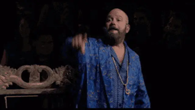 A man in a blue robe sings enthusiastically about The Green Bay Packers in a scene from Pitch Perfect 2.