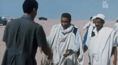 Muammar Gaddafi greets and hugs a man in the desert, surrounded by other men.