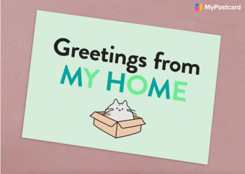 A cute cartoon cat sits in a box on a postcard with the message 'Greetings from MY HOME' from MyPostcard.