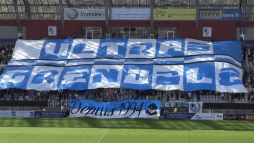 Fans of Grenoble Foot 38 display a massive 'Ultras Grenoble' tifo banner in the stadium.