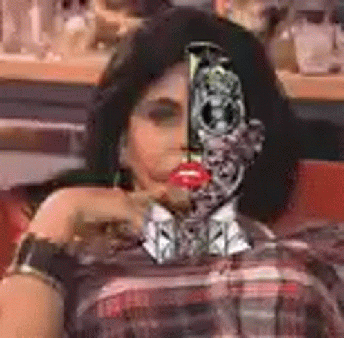 Gretchen with a bionic face, half human and half robot, sitting on a couch.