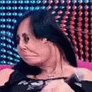 Gretchen laughing hysterically with a funny, distorted face against a vibrant, colorful background.
