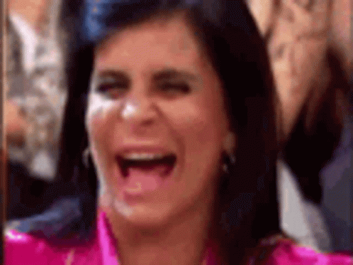 Brazilian singer Gretchen Maria Odete Brito De Miranda laughing heartily with her mouth open.