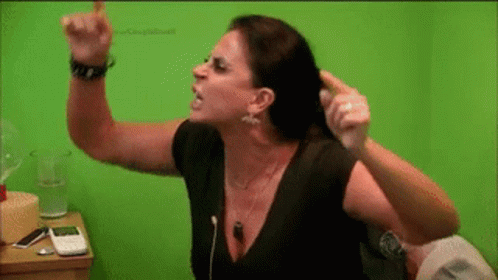 Brazilian singer Gretchen animatedly gestures and appears stressed and angry in front of a green wall.