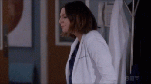 Amelia Shepherd, played by Caterina Scorsone, peeks around a corner in a scene from Grey's Anatomy, wearing her lab coat.