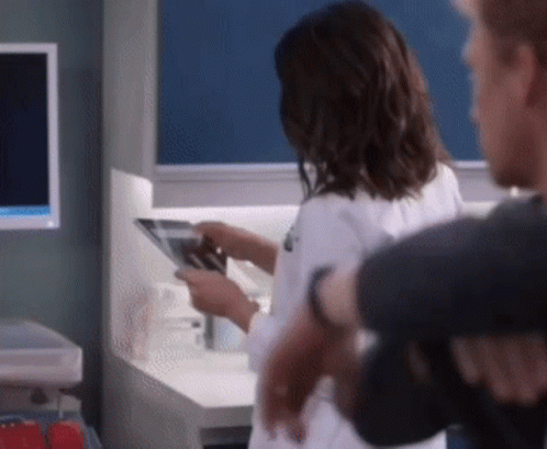 Amelia Shepherd, played by Caterina Scorsone, in her doctor's lab coat, reviews an X-ray on a monitor while holding a tablet.