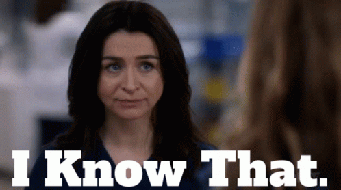 Amelia Shepherd from Grey's Anatomy, portrayed by Caterina Scorsone, looks directly at the camera and says 'I Know That'.