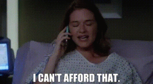 April Kepner, played by Sarah Drew, in a hospital gown, says 'I can't afford that' on the phone.