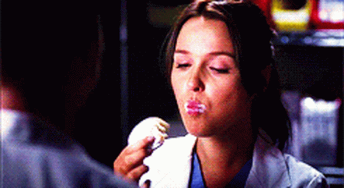 Jo Wilson (Camilla Luddington) enjoys a donut in her lab coat, a sweet moment from Grey's Anatomy.