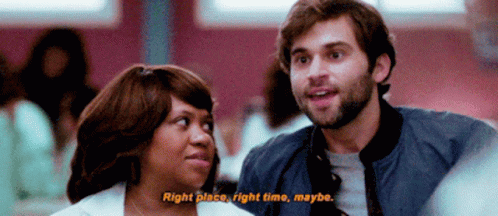 Levi Schmitt (Jake Borelli) from Grey's Anatomy says 'Right place, right time, maybe' to a woman.