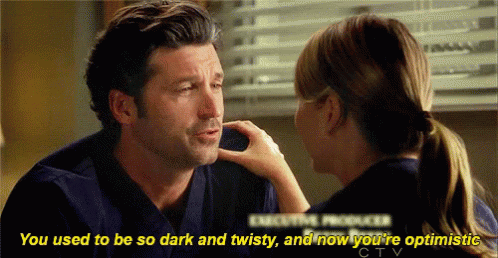 Meredith Grey and Derek Shepherd from Grey's Anatomy discussing optimism and past 'dark and twisty' nature.