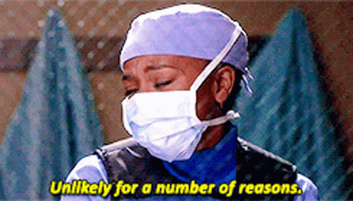 Dr. Stephanie Edwards from Grey's Anatomy, played by Jerrika Hinton, states 'Unlikely for a number of reasons' while wearing a surgical mask.