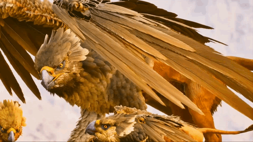 A majestic griffin with two smaller griffins, possibly its young, in a snowy or rocky landscape.