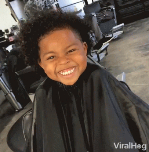 Adorable boy with curly hair flashes a big, toothy grin and dimples during his haircut.