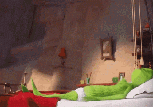 The Grinch wakes up in bed, stretching and looking around, seemingly unable to sleep.