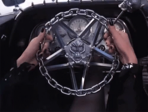 A person's hands grip a car's custom steering wheel, featuring a pentagram design and chain wrapping.