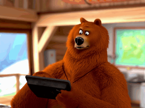 Grizzy, the brown bear from Grizzy and the Lemmings, looks thoughtful while holding a small device.