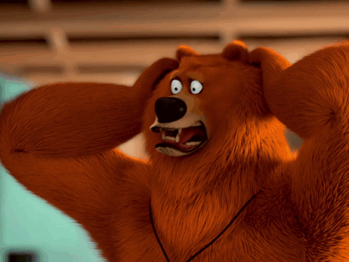 Grizzy, the orange bear from Grizzy and the Lemmings, reacts with shock, holding his head in disbelief.