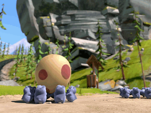 The Lemmings from Grizzy and the Lemmings gather around a floating spotted egg in a cartoon scene.