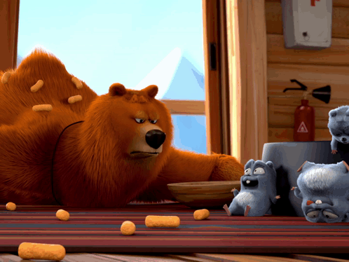 Grizzy the bear is startled by the mischievous Lemmings while surrounded by snacks in their cabin.