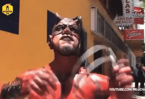 Gronda Xxx, the red demon luchador, appears in public, possibly for an interview, showcasing his intimidating persona.