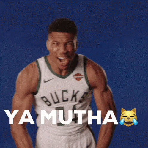 Giannis Antetokounmpo in a Bucks jersey reacting with the 'Ya Mutha' meme and a laughing cat emoji.
