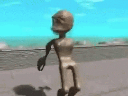 Gt17s Azura, a cartoon character, walks on a beach wearing a helmet and backpack.