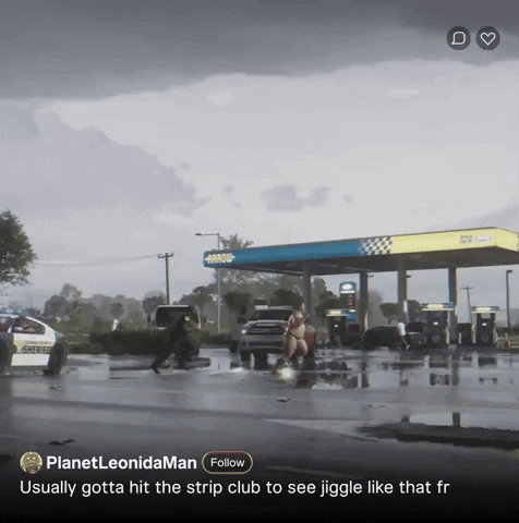 Real-life gas station scene with a caption hinting at GTA VI's Vice City atmosphere.