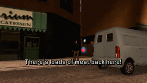 A classic Grand Theft Auto scene featuring a character next to a van, uttering the memorable line: 'There's loads of meat back here!'
