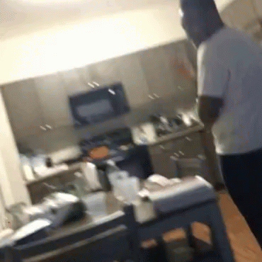 A man quickly turns and runs out of a kitchen, making a swift exit.