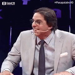 A man in a suit smiles and gestures on the set of Canal 10's Pasapalabra10.