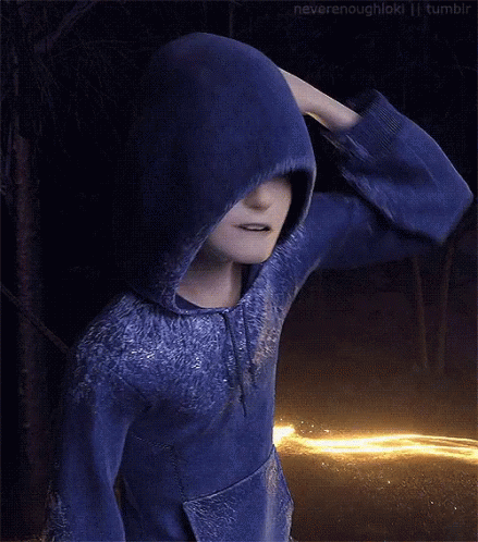 Jack Frost, the Guardian of Ice, in his blue hoodie with white hair and purple eyes.