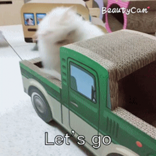 A fluffy white cat rides in a green cardboard pickup truck with 'Let's go' text.