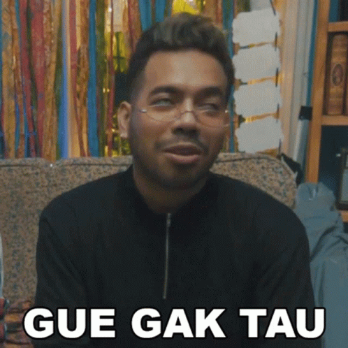 Glenn Samuel, wearing glasses, sits on a couch with the phrase 'Gue Gak Tau' (I Don't Know) displayed.