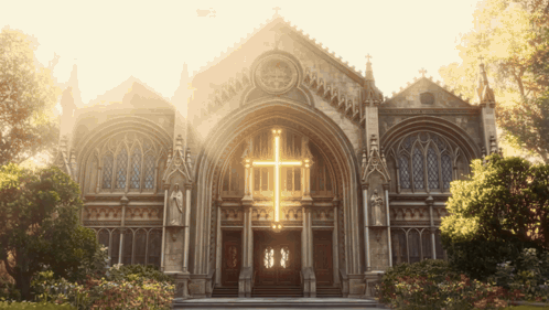 a large church with a cross on the front