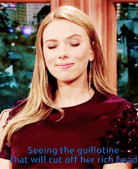 A woman reacts to seeing the guillotine that will cut off her rich head, with a knowing smirk.