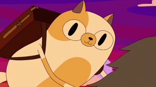A charming cat-like character from Adventure Time winks playfully while carrying a suitcase on its back.