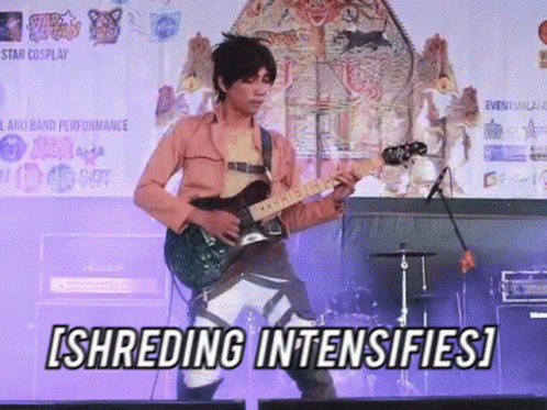 Nanda Krist intensely shreds on an electric guitar on stage, with 'Shredding Intensifies' caption.