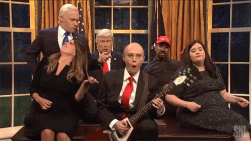 SNL cast members Alec Baldwin as Trump, Jim Carrey as Biden, and Chris Redd as Kanye West rock out with a guitar solo.