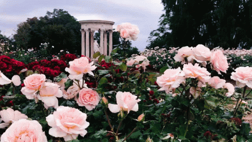 A serene rose garden featuring vibrant pink and red roses, with a classical gazebo standing gracefully in the background.