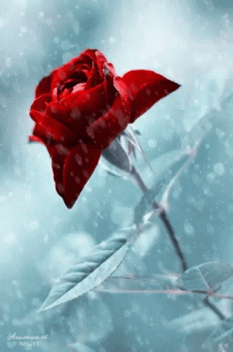 A beautiful red rose surrounded by sparkling snow and leaves on a serene blue background.