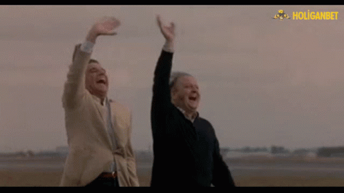 Two men enthusiastically wave their arms, saying goodbye, with a 'HOLIGANBET' logo visible in the background.