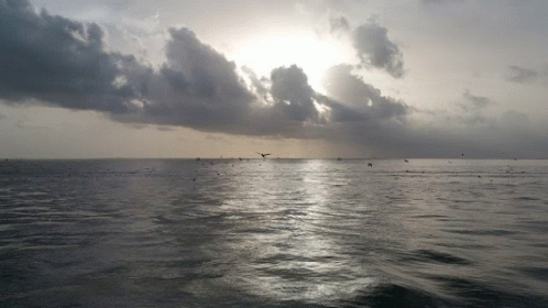 Birds fly over the shimmering Gulf of Mexico as the sun shines through dramatic clouds.