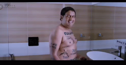 Gullu Dada, shirtless and covered in writing, interacts with another man in a bathroom.