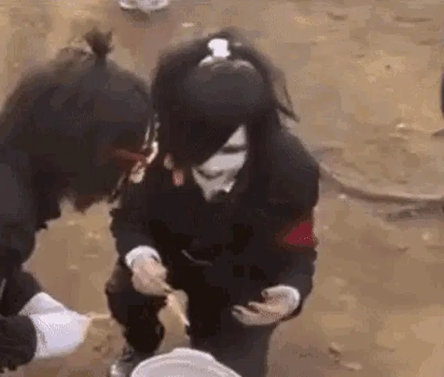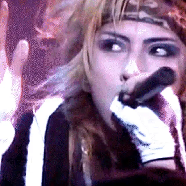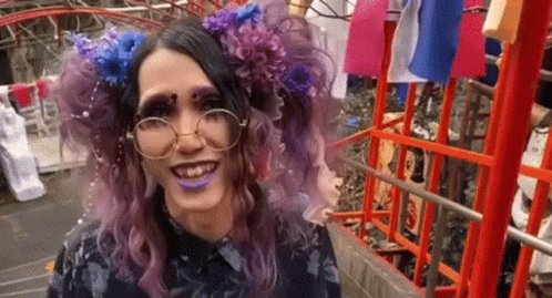 Gulu Gulu Lanju with purple hair and glasses smiles playfully as the camera gets too close.