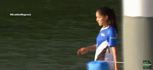 Marysol performs a gun hands mimic gesture during an Exatlón challenge, showing her competitive spirit.
