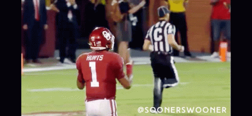 Jalen Hurts of the Oklahoma Sooners performs his signature 'Gun Holster' celebration after a play.
